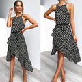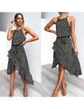 Rundhalsausschnitt, hohe, elastische Taille, mit abnehmbarer Schärpe zum Binden und ein schmeichelhafter mittellanger Rock mit lustigen asymmetrischen Stufen.